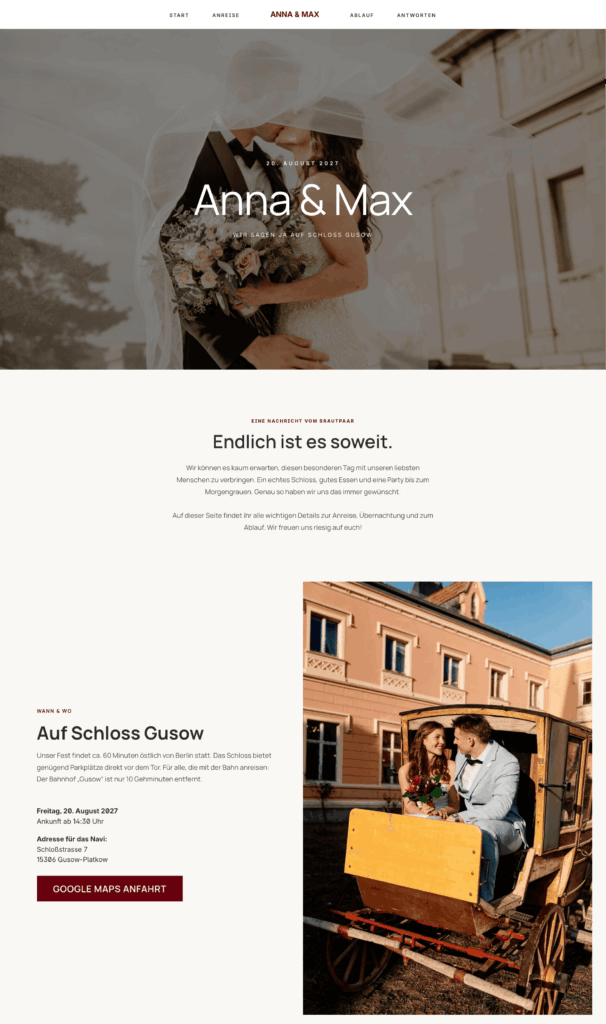 Im Königspaar-Paket programmieren wir alles maßgeschneidert auf euren Look. Eigene .de-Domain (z.B. www.anna-und-max.de), Farben passend zu den Blumen und Mehrsprachigkeit für internationale Gäste. Perfektion bis ins Pixel.